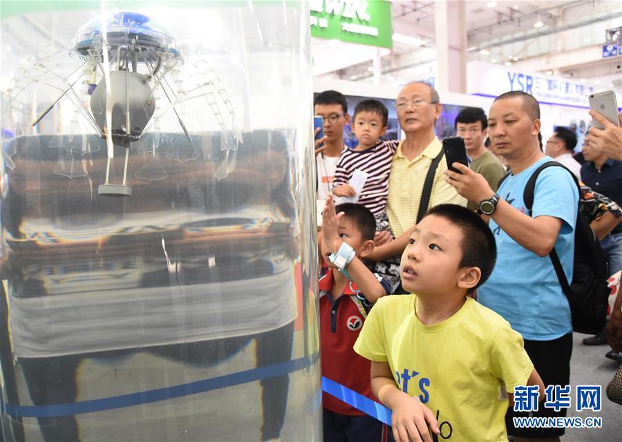 观众在2019世界机器人大会中参观仿生水母(8月23日摄)。 新华社发(任超 摄)