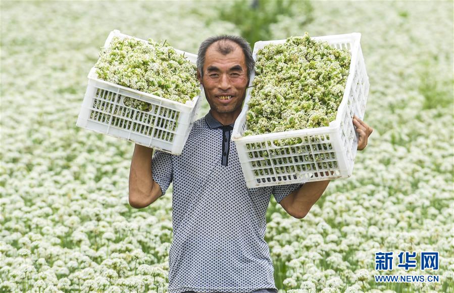 8月24日,河北省衡水市武邑县武罗农产品种植专业合作社的农民在搬运韭菜花。 初秋时节,河北省衡水市武邑县武罗农产品种植专业合作社千亩无公害韭菜迎来盛花期,当地农民加紧采摘韭菜花。该韭菜种植引入沼液替代传统化肥,采取“以虫治虫”的方式消灭韭蛆。武邑县每年有60多万公斤韭菜花销往各地,是当地农民增收的特色产业之一。 新华社记者 李晓果 摄