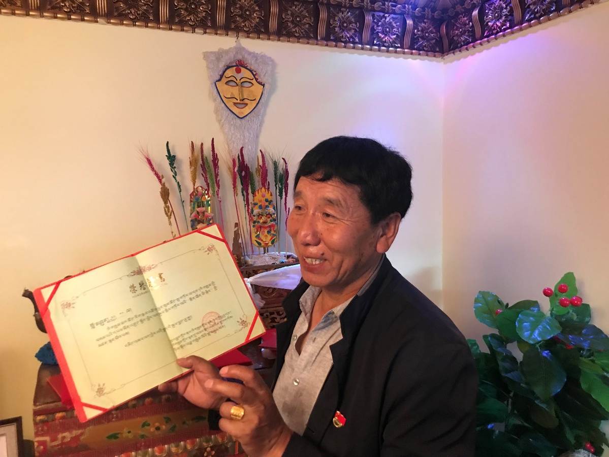 对克松文化建设的付出让达瓦获得了村民的认可。图为达瓦给记者展示荣誉证书。(西藏自治区党委网信办 李云彤 供图)