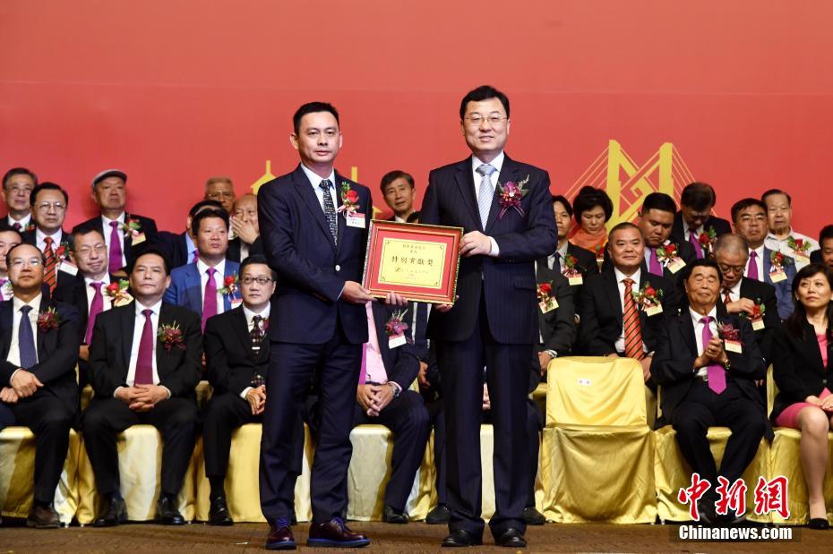 8月24日晚上,外交部驻香港特派员公署特派员谢锋(前排右)为嘉宾颁发特别贡献奖。香港福建同乡会隆重举行庆祝成立80周年庆典活动,一众嘉宾与同乡会成员一起共度庆典。 中新社记者 李志华 摄