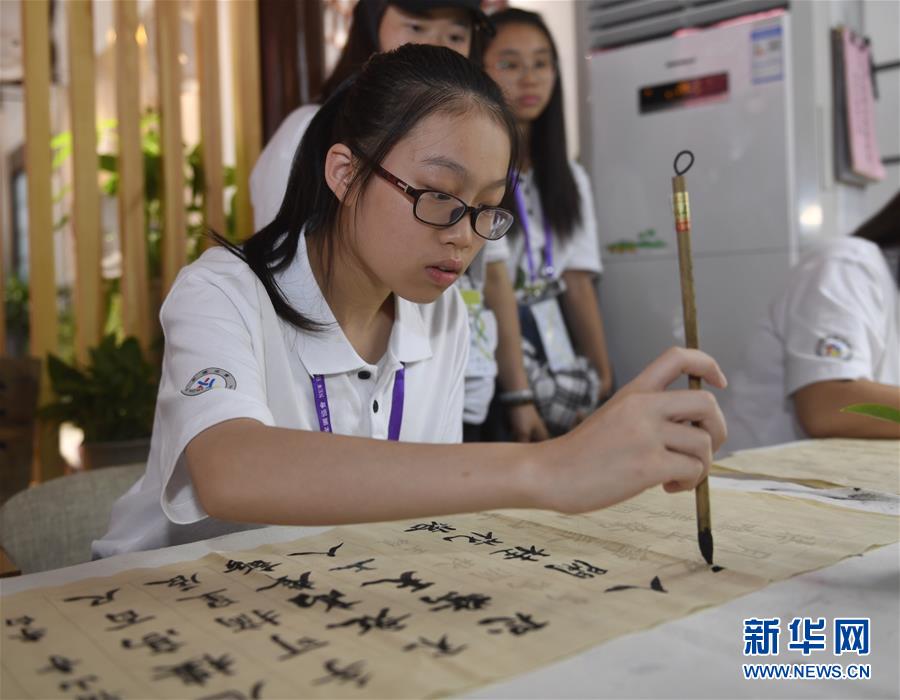 8月25日,参加交流活动的香港青年许咏淇在水井坊社区教育传统文化体验馆内书写毛笔字。新华社记者刘坤摄