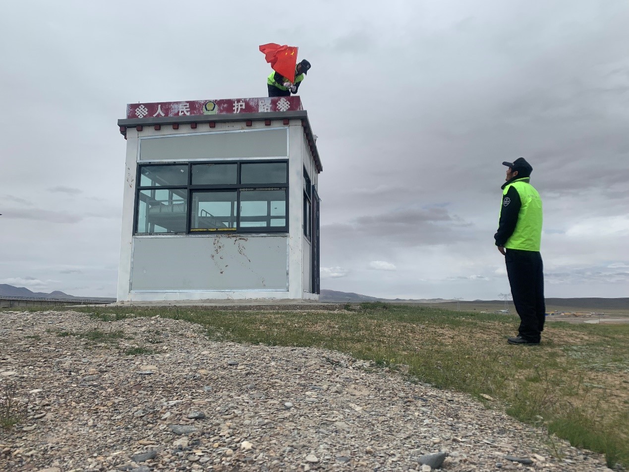 尽管条件艰苦,大队党支部带领全体队员坚守岗位、立足本职、战天斗地,一公里一个岗,规律地分布在几十公里的铁路沿线,保质保量完成着每天的守护任务。已经参加护路工作7年的阿色巴和他的队友正在为岗亭换上新国旗。人民网 宋晨 摄