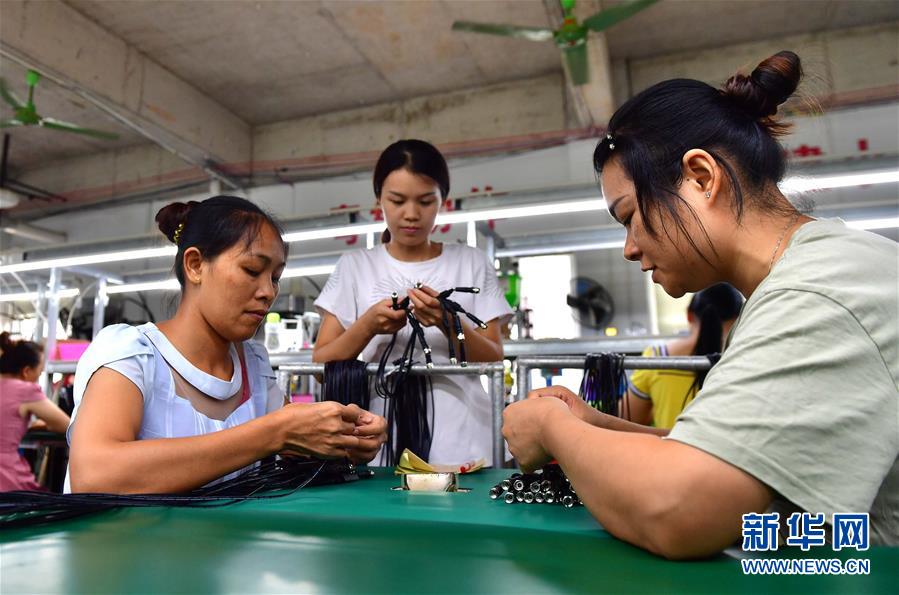 8月26日,在融水苗族自治县苗家小镇小区的粤桂扶贫车间内,工人在生产手机数据线。 新华社记者 黄孝邦 摄