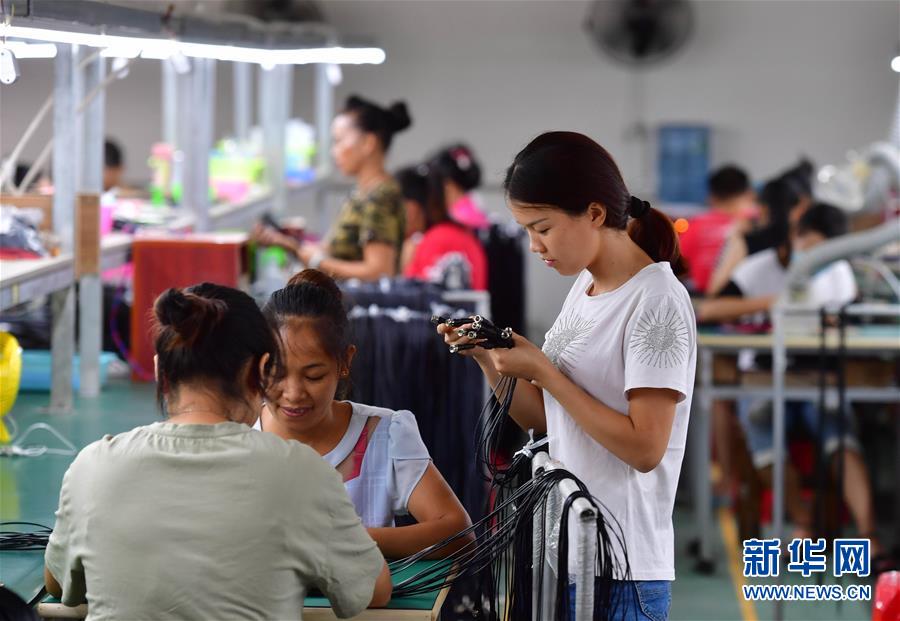 8月26日,在融水苗族自治县苗家小镇小区的粤桂扶贫车间内,工人在生产手机数据线。 新华社记者 黄孝邦 摄