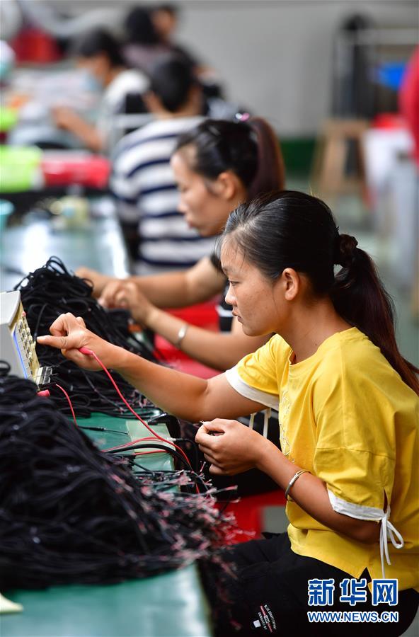 8月26日,在融水苗族自治县苗家小镇小区的粤桂扶贫车间内,工人在生产手机数据线。 新华社记者 黄孝邦 摄