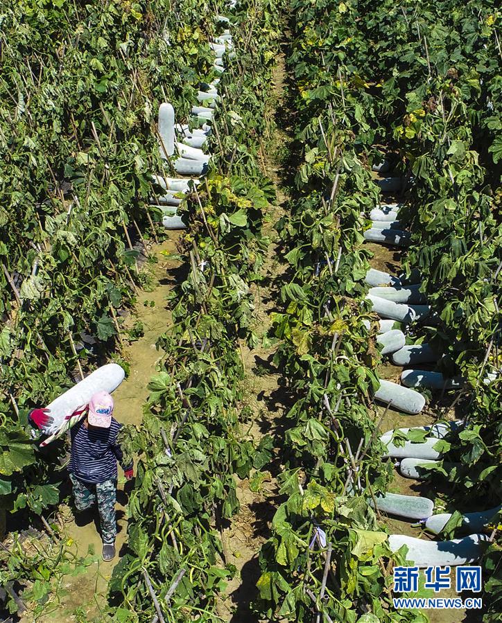 8月28日,在河北省香河县渠口镇西河头村冬瓜基地,种植户在搬运冬瓜(无人机拍摄)。 近日,河北省香河县渠口镇西河头村的冬瓜丰收,成熟的冬瓜将销往北京等地菜市场。西河头村从上世纪90年代初开始种植冬瓜,并不断引进优良品种,扩大种植规模,目前,冬瓜种植面积已达600亩,是远近闻名的冬瓜专业种植村。 新华社记者李晓果摄