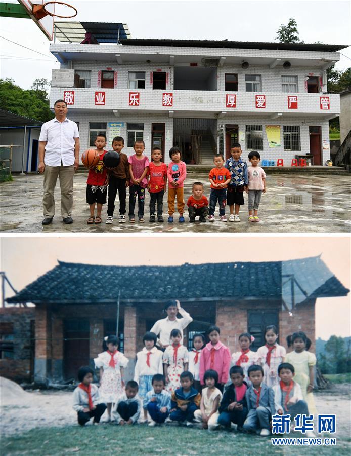 拼版图片:上图为8月27日吴国先与今年入学的部分学生在谷港小学教学楼前合影(新华社记者 杨文斌 摄);下图为80年代吴国先与谷港小学学生在老教室前合影(翻拍资料照片)。新华社发