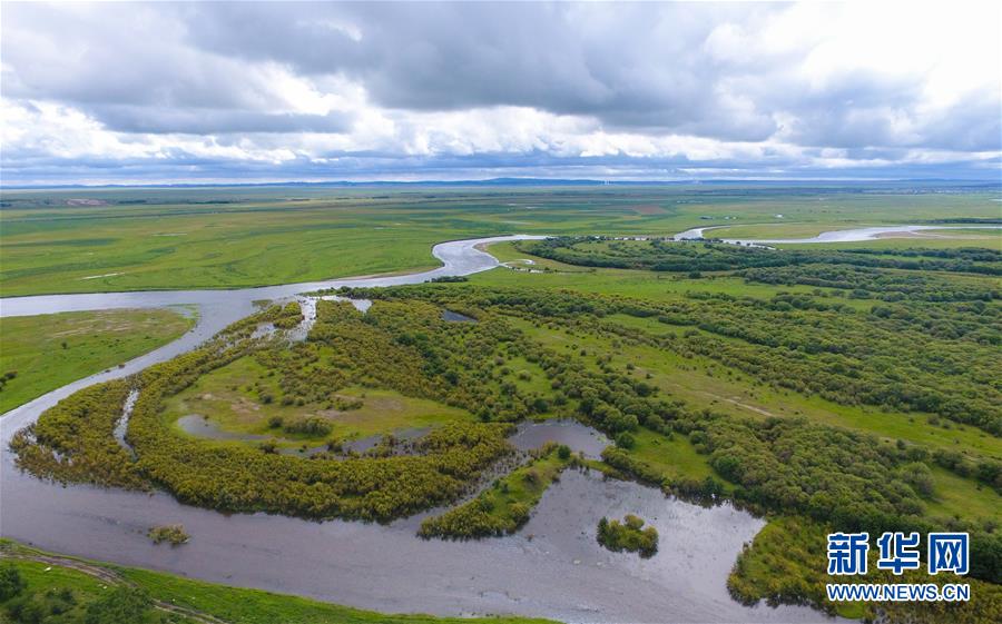 这是8月26日无人机拍摄的呼伦贝尔大草原。 位于内蒙古东北部的呼伦贝尔大草原景色宜人。秋雨过后,云层低垂笼罩四野,蜿蜒曲折的河流在草原上流淌,构成一幅动人画卷。 新华社记者 彭源 摄
