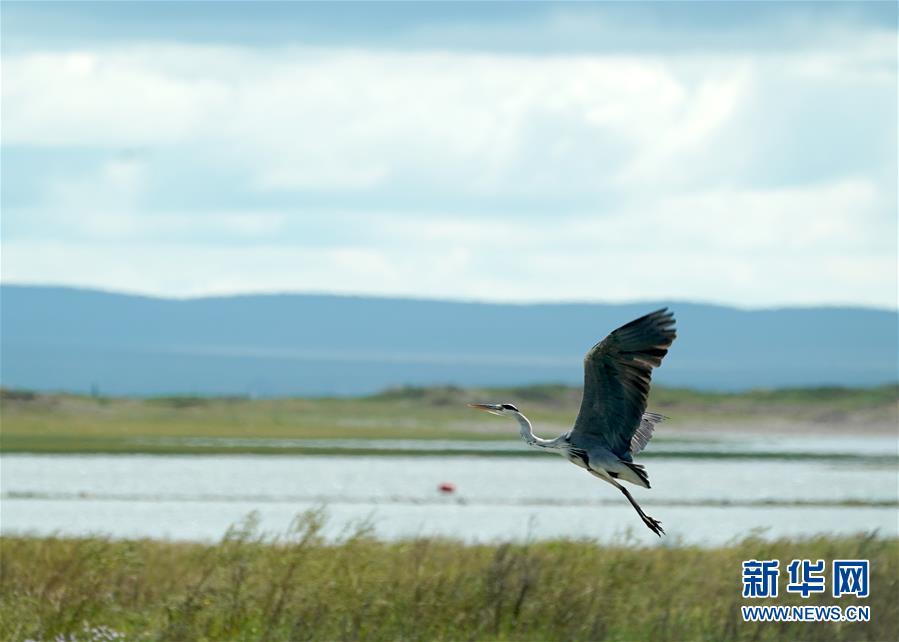8月28日,一只苍鹭在呼伦湖岸边起飞。新华社记者陈建力摄