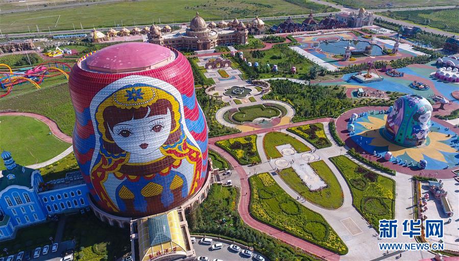 这是满洲里套娃广场(8月29日无人机拍摄)。 坐落于内蒙古边境城市满洲里市的套娃广场,是全国唯一以俄罗斯传统工艺品——套娃形象为主题的大型综合旅游度假景区,该景区由主题园区、主题娱乐、主题酒店三部分组成,游客走进套娃广场,仿佛来到一个五彩缤纷的童话世界。 新华社记者 彭源 摄