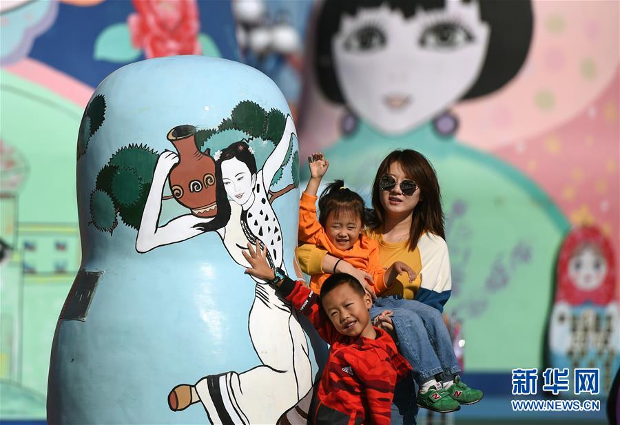 游客在满洲里套娃广场内拍照留念(8月29日摄)。 坐落于内蒙古边境城市满洲里市的套娃广场,是全国唯一以俄罗斯传统工艺品——套娃形象为主题的大型综合旅游度假景区,该景区由主题园区、主题娱乐、主题酒店三部分组成,游客走进套娃广场,仿佛来到一个五彩缤纷的童话世界。 新华社记者 任军川 摄