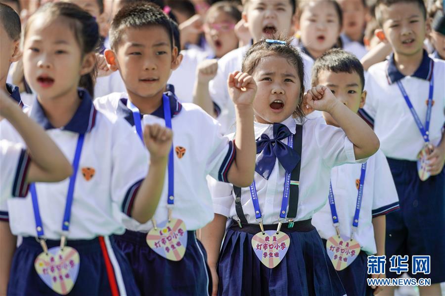 9月1日,在北京市东城区灯市口小学灯市口校区的开学典礼上,一年级新生在进行入学宣誓。新华社记者 沈伯韩 摄