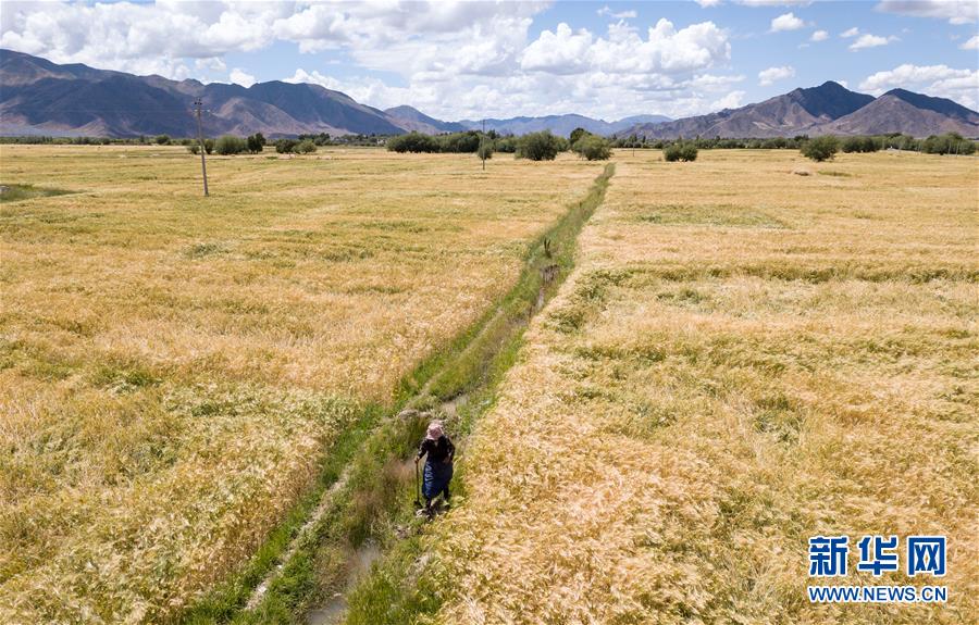 村民在日喀则市白朗县境内的农田里劳作(8月31日无人机拍摄)。 位于年楚河畔的西藏日喀则市白朗县素有“西藏粮仓”的美誉。秋收时节,一片片成熟的青稞田,犹如金色的地毯,铺展在大地上。 新华社记者 李鑫 摄