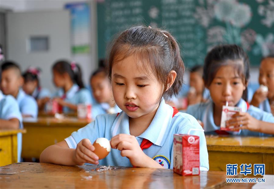 9月1日,河北省乐亭县闫各庄镇中心小学的孩子们在课间享用营养餐。 从9月1日起,河北省全省农村小学生都能享受到免费营养餐。营养餐供餐采取课间加餐模式,每天为每个孩子提供一盒学生饮用奶和一个鸡蛋。 新华社记者 杨世尧 摄
