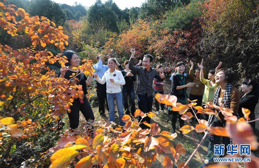 游人在延安市宜川县蟒头山国家森林公园秋游(2009年10月15日摄)。 新华社记者陶明摄