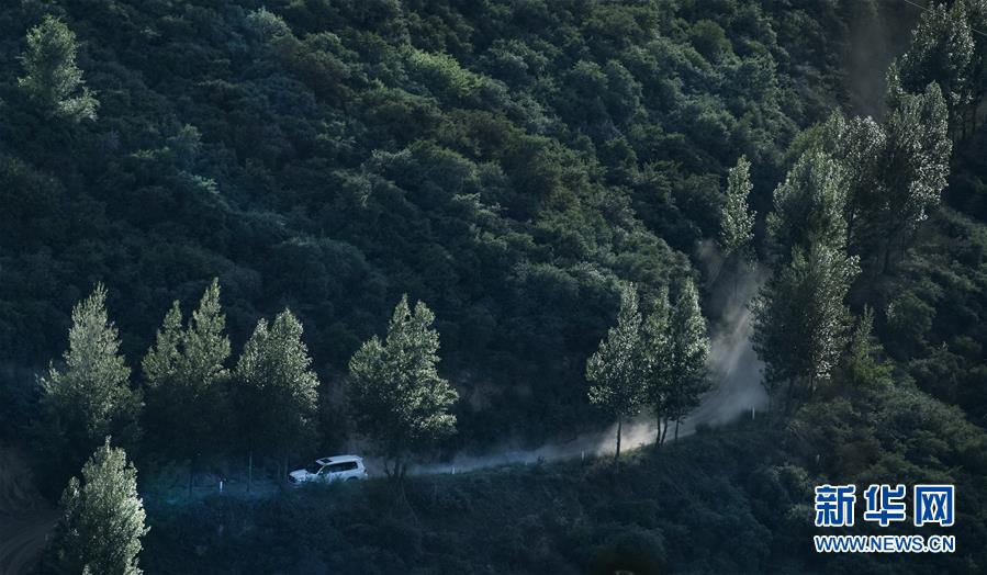 一辆汽车行驶在绿树成荫的延安市吴起县走马台村的山道上(6月5日摄)。 新华社记者陶明摄