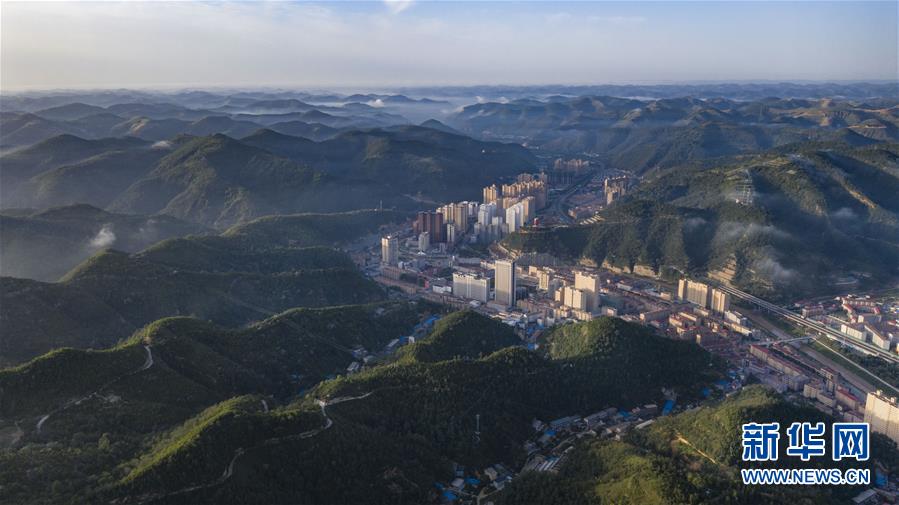 青山环抱的延安市安塞区城区(8月10日无人机拍摄)。 新华社记者陶明摄