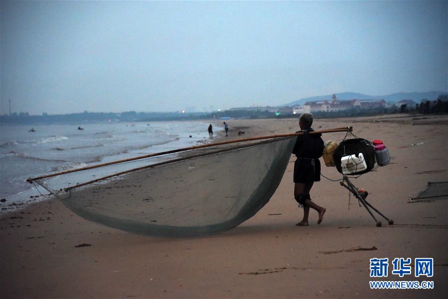 9月2日,渔民扛着装备下海捕小虾。 在清晨的山东省日照市近海海岸,有一群“踩高跷”捕小虾的捕虾人。他们在离岸边10余米的水中脚踩一米左右长的木棍,推着渔网与海岸平行前进。这种独特的捕虾方式,成为日照海岸线上一道别样的风景。 新华社记者王凯摄