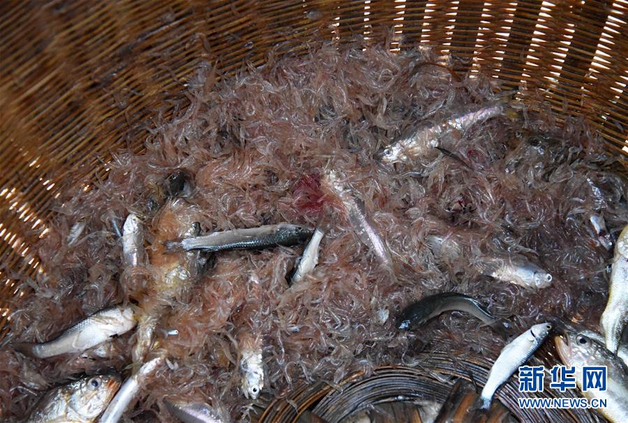 一位渔民捕获的小虾和一些小鱼(9月2日摄)。 在清晨的山东省日照市近海海岸,有一群“踩高跷”捕小虾的捕虾人。他们在离岸边10余米的水中脚踩一米左右长的木棍,推着渔网与海岸平行前进。这种独特的捕虾方式,成为日照海岸线上一道别样的风景。 新华社记者王凯摄