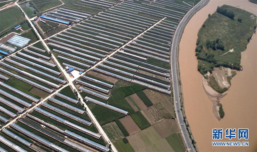 这是三合村的蔬菜大棚(8月29日无人机拍摄)。 甘肃省白银市靖远县东湾镇三合村是一个黄河上游的村庄。站在高处看去,温室鳞次栉比,远处黄河如带。黄河畔的人们正在远离汛期水害之苦,并因水得利,进行着从粮到菜再到花的种植结构转变。 新华社记者 刘诗平 摄