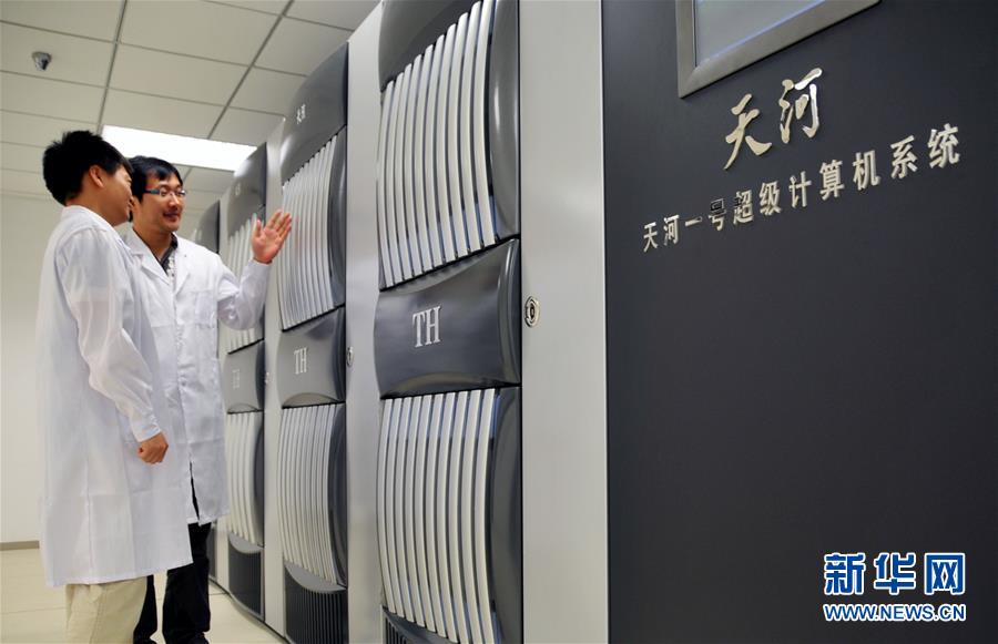 国家超算天津中心应用研发部部长孟祥飞(右一)带同事巡检“天河一号”运行状况(资料照片)。 新华社记者毛振华摄