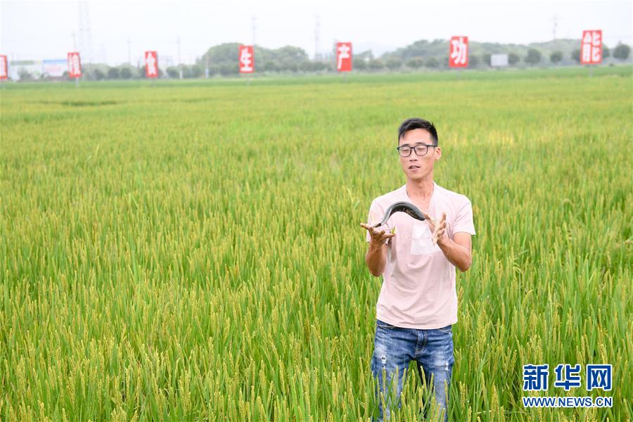 9月3日,合作社负责人孙建龙在稻田里抓起一条乌鳢鱼查看长势。 新华社记者翁忻旸摄