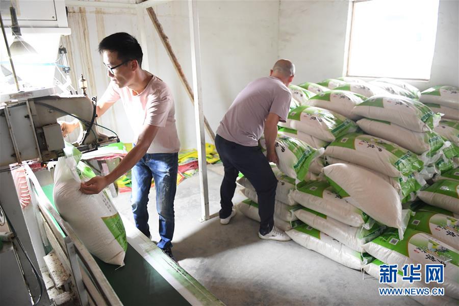9月3日,合作社负责人孙建龙(左)在仓库打包“绿色”稻米。 新华社记者翁忻旸摄