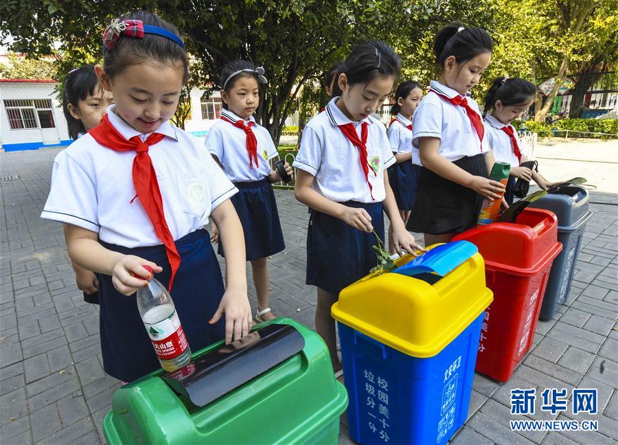 9月3日,河北省文安县第二小学学生将不同种类垃圾投入垃圾桶中。 今年以来,河北省廊坊市文安县深入开展“垃圾分类进校园”主题活动,通过讲解和现场演示,让同学们深入了解垃圾分类的益处,提倡绿色生活。 新华社记者李晓果摄
