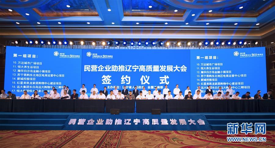2018年8月29日,“2018中国民营企业500强峰会”在沈阳召开。这是峰会举办的“民营企业助推辽宁高质量发展大会”的签约仪式现场。 新华社记者 杨青 摄