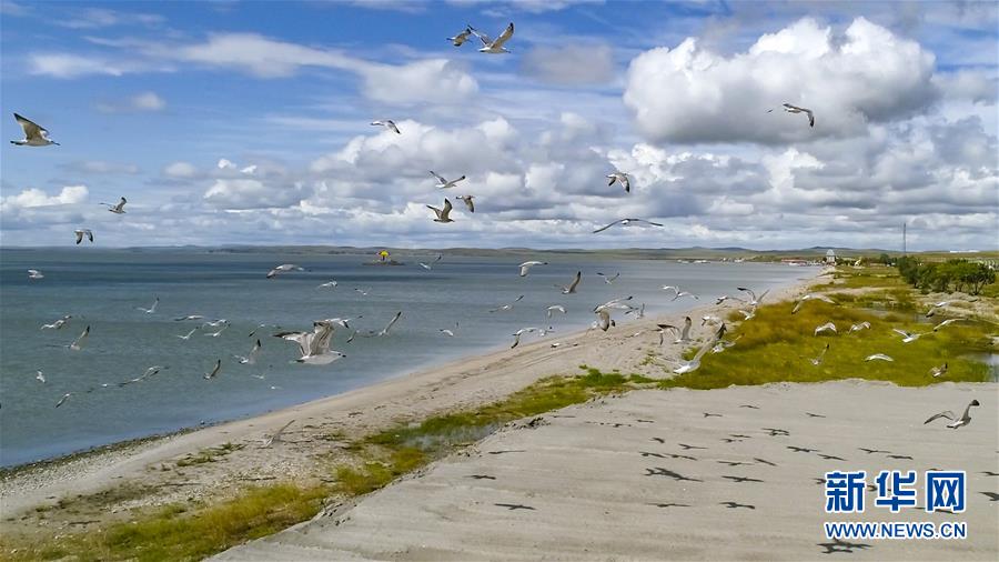 8月28日无人机拍摄的呼伦湖畔的水鸟。 新华社记者沈伯韩摄
