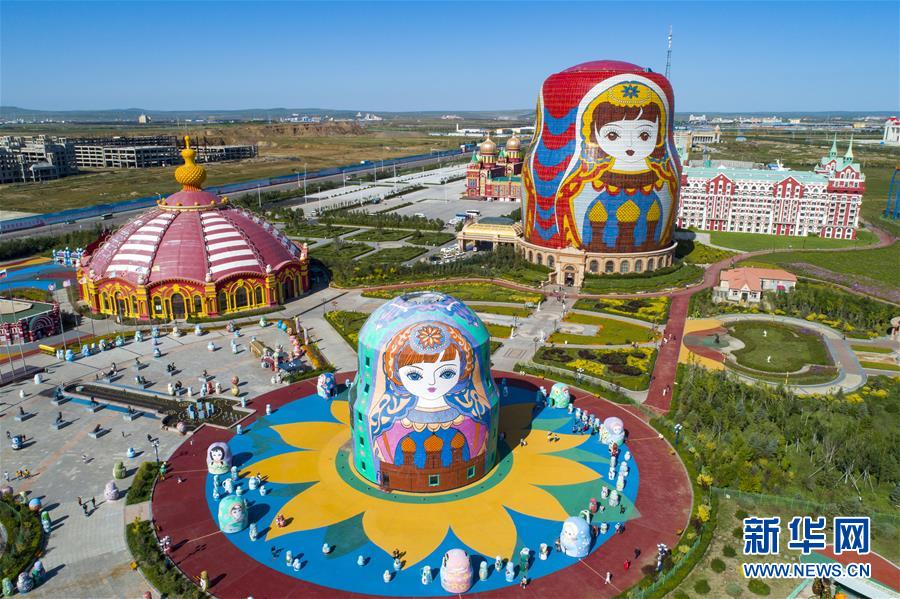 8月29日无人机拍摄的满洲里市套娃广场景区。满洲里市位于呼伦贝尔大草原腹地。 新华社记者沈伯韩摄