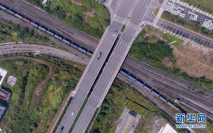 9月2日,“陆海新通道”铁海联运首次铁路箱下海出境专列从一座公路桥下驶过(无人机拍摄)