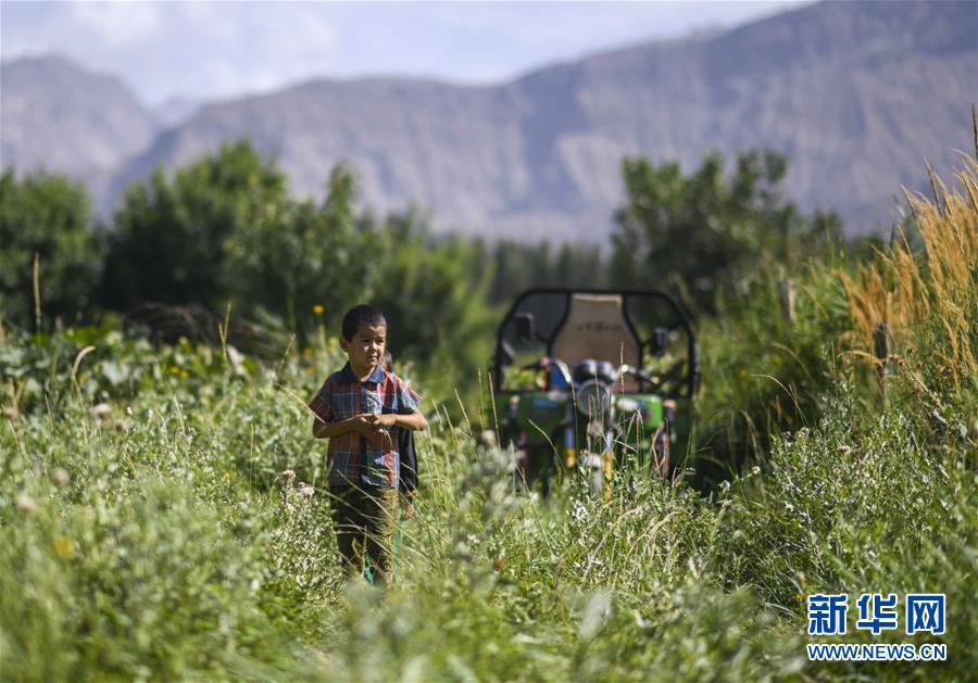 在且末县江尕勒萨伊村,小朋友在蒜田里玩耍(8月22日摄)。新华社记者 赵戈 摄