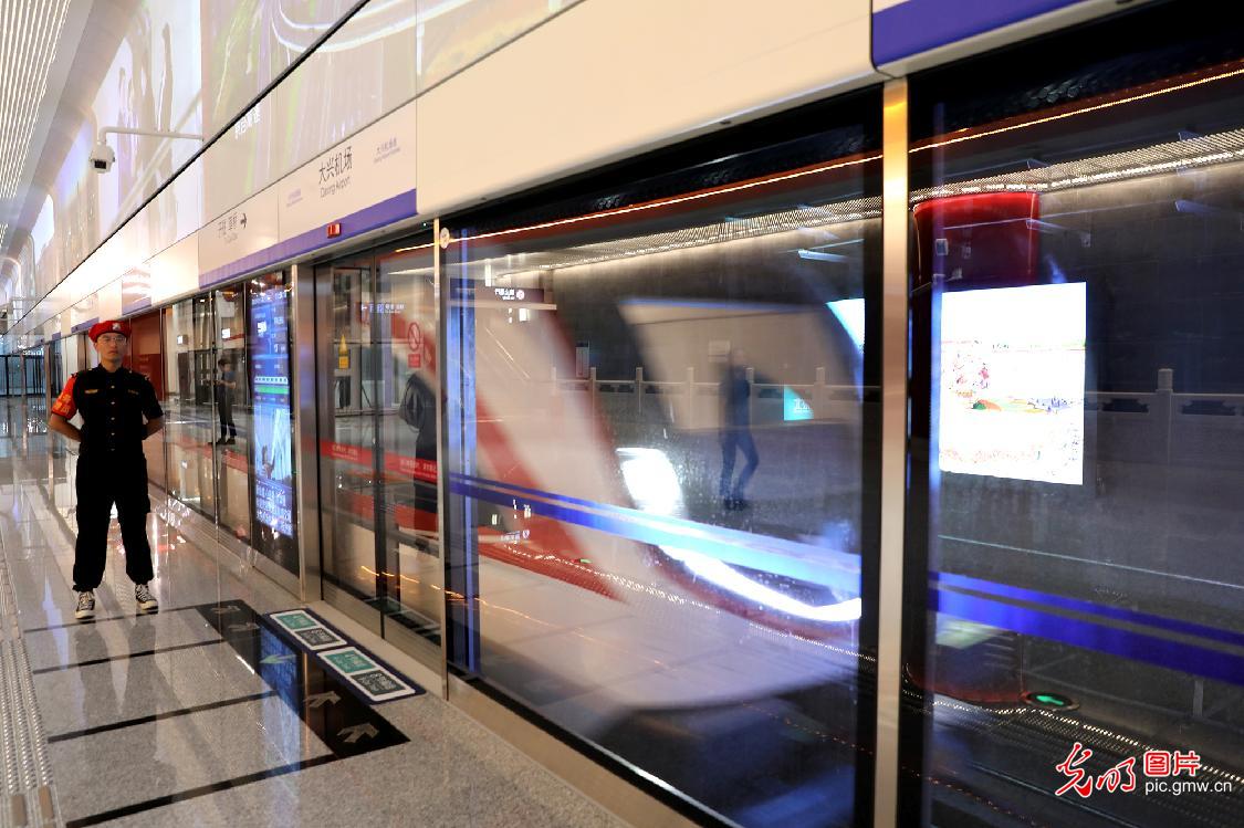 2019年9月4日,地铁大兴机场线正在进行空载试运行。大兴国际机场线一期工程(草桥站-大兴国际机场站)线路总长41.36公里,共设大兴国际机场站、大兴新城站、草桥站三站。乘客可在草桥站搭乘时速160公里的轨道交通列车,19分钟直抵大兴国际机场航站楼,实现空陆交通“无缝衔接”和“零距离换乘”。开通初期,大兴国际机场线全天运行时间将不少于16.5小时,最小发车间隔不超过8分30秒。图为大兴机场站一列车驶入站内。( 光明网记者 赵金悦摄/ 光明图片)