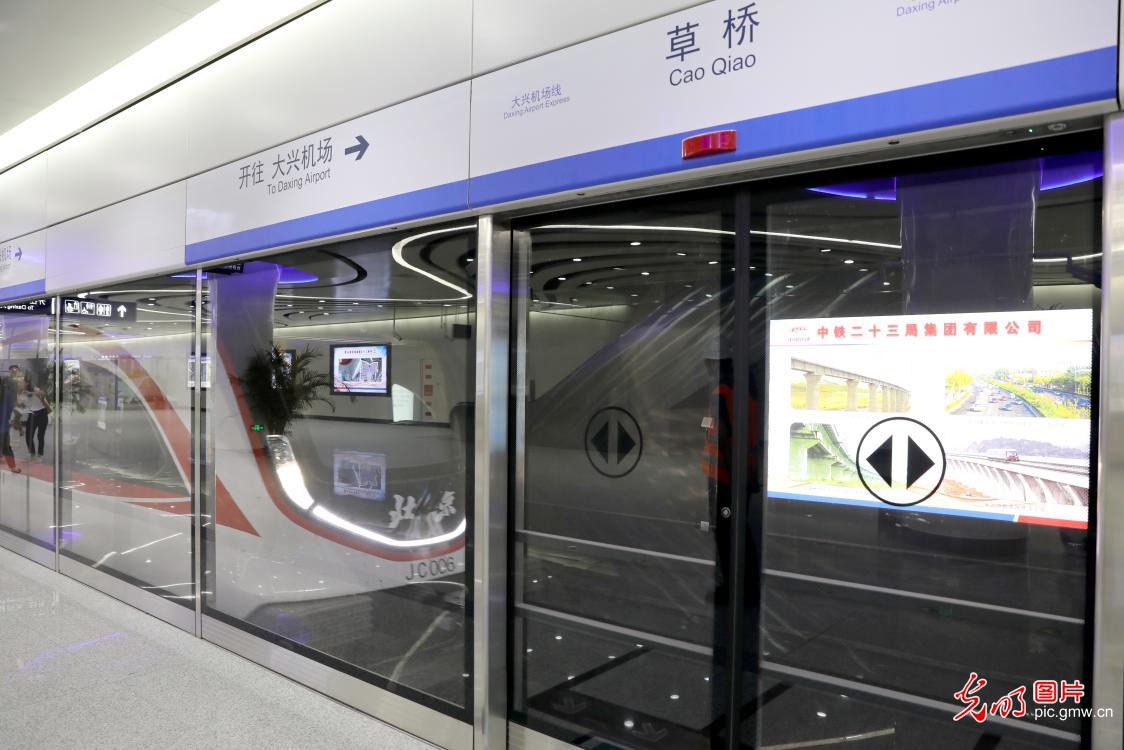 2019年9月4日,地铁大兴机场线正在进行空载试运行。大兴国际机场线一期工程(草桥站-大兴国际机场站)线路总长41.36公里,共设大兴国际机场站、大兴新城站、草桥站三站。乘客可在草桥站搭乘时速160公里的轨道交通列车,19分钟直抵大兴国际机场航站楼,实现空陆交通“无缝衔接”和“零距离换乘”。开通初期,大兴国际机场线全天运行时间将不少于16.5小时,最小发车间隔不超过8分30秒。图为草桥站内一列列出进站。( 光明网记者 赵金悦摄/ 光明图片)