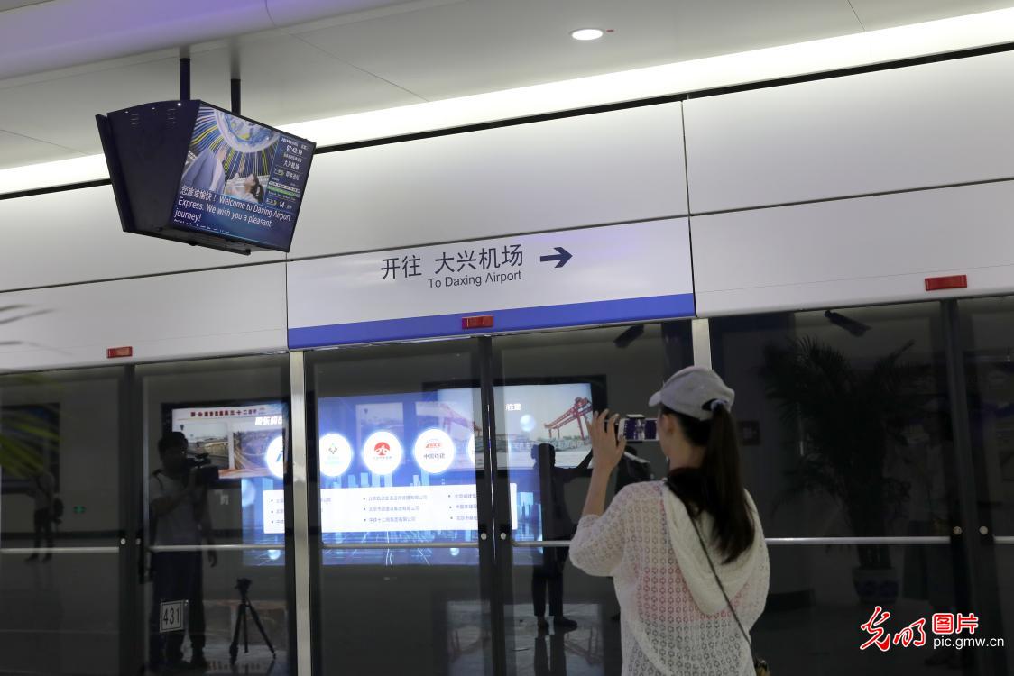 2019年9月4日,地铁大兴机场线正在进行空载试运行。大兴国际机场线一期工程(草桥站-大兴国际机场站)线路总长41.36公里,共设大兴国际机场站、大兴新城站、草桥站三站。乘客可在草桥站搭乘时速160公里的轨道交通列车,19分钟直抵大兴国际机场航站楼,实现空陆交通“无缝衔接”和“零距离换乘”。开通初期,大兴国际机场线全天运行时间将不少于16.5小时,最小发车间隔不超过8分30秒。图为草桥站内。( 光明网记者 赵金悦摄/ 光明图片)