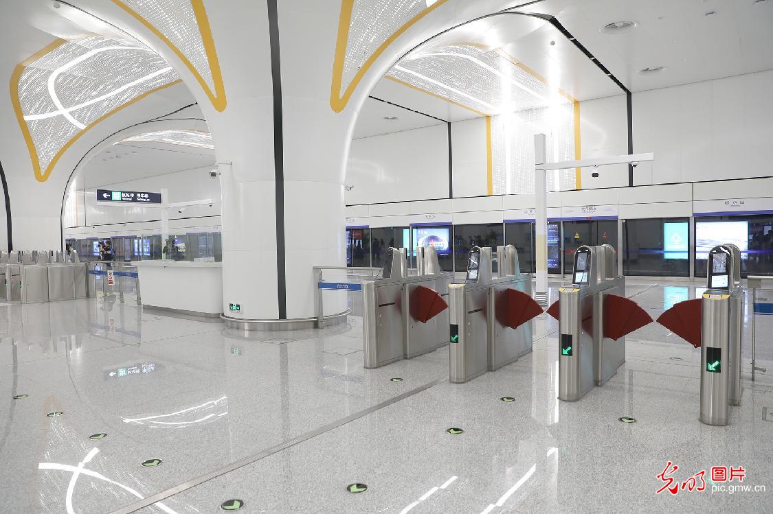 2019年9月4日,地铁大兴机场线正在进行空载试运行。大兴国际机场线一期工程(草桥站-大兴国际机场站)线路总长41.36公里,共设大兴国际机场站、大兴新城站、草桥站三站。乘客可在草桥站搭乘时速160公里的轨道交通列车,19分钟直抵大兴国际机场航站楼,实现空陆交通“无缝衔接”和“零距离换乘”。开通初期,大兴国际机场线全天运行时间将不少于16.5小时,最小发车间隔不超过8分30秒。图为大兴机场站出站口。( 光明网记者 赵金悦摄/ 光明图片)