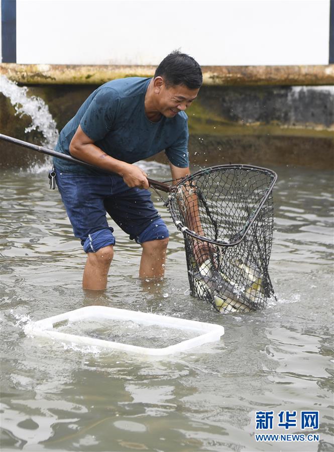 9月3日,蒋开均在开州侯家溪冷水鱼养殖基地成鱼养殖池内捕鱼。新华社记者王全超摄