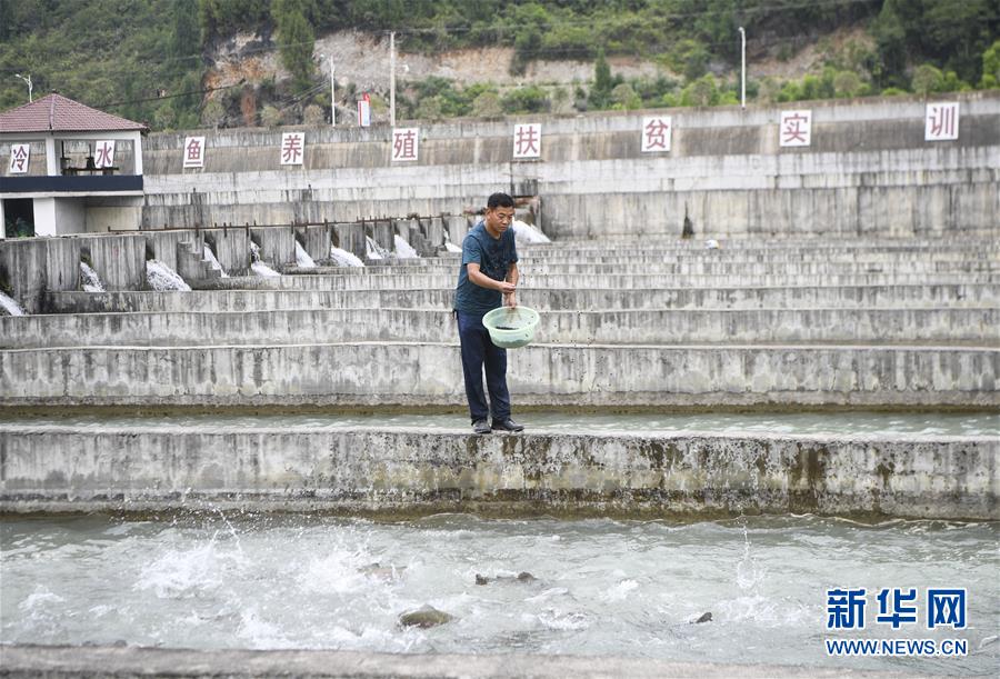 9月3日,蒋开均在开州侯家溪冷水鱼养殖基地内给虹鳟鱼喂食。新华社记者王全超摄