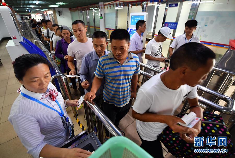 9月4日,乘客在海口秀英港轮渡码头检票。 据海南省气象台消息,9月4日白天起琼州海峡风力减弱为8级。海口海事局发出通知,抗风等级达到8级的客滚船于4日10时起恢复通航。 新华社记者 郭程 摄