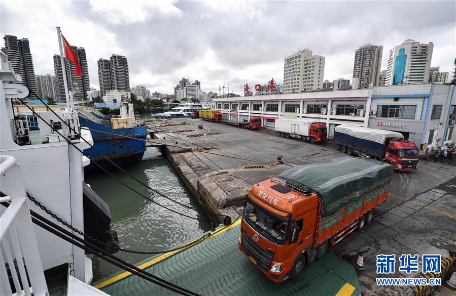 9月4日,车辆在海口秀英港轮渡码头上船。 据海南省气象台消息,9月4日白天起琼州海峡风力减弱为8级。海口海事局发出通知,抗风等级达到8级的客滚船于4日10时起恢复通航。 新华社记者 郭程 摄
