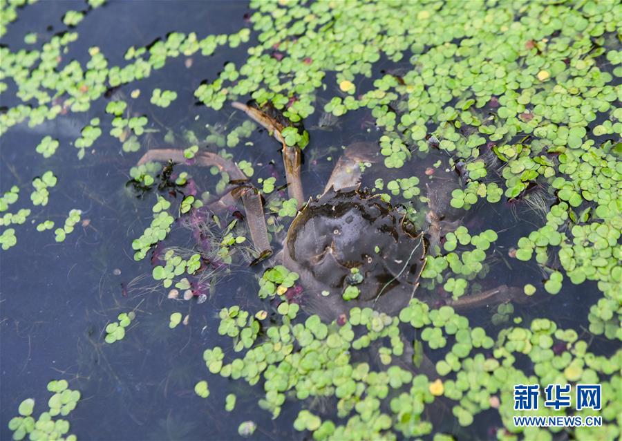 浙江省湖州市织里镇恒鑫水产养殖专业合作社生态池塘里养殖的湖蟹(9月4日摄)。合作社养殖400多亩湖蟹,年产值约300万元。 新华社记者 徐昱 摄