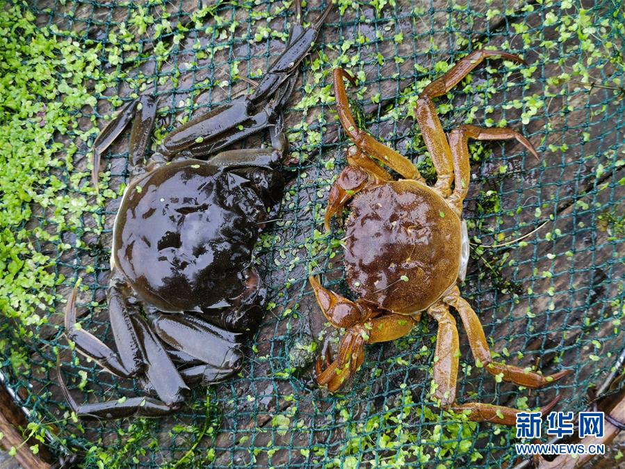 这是一只刚完成脱壳的湖蟹(左),右侧是它刚刚脱下的壳,再过20天左右,它就能长成一只重约4两的成品湖蟹(9月4日摄)。 新华社记者 徐昱 摄