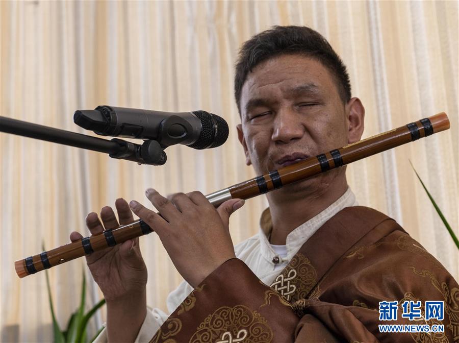 9月4日,乐团成员达琼在活动现场演奏笛子。 当日,西藏咔哒嘎布盲人乐团来到拉萨市林周县敬老院,在雪顿节期间为老人们送上精彩演出。盲人乐团的成员长期得到社会各界的帮助,他们也努力用自己力所能及的方式回馈社会,为人们送去欢乐。 新华社发(孙非 摄)