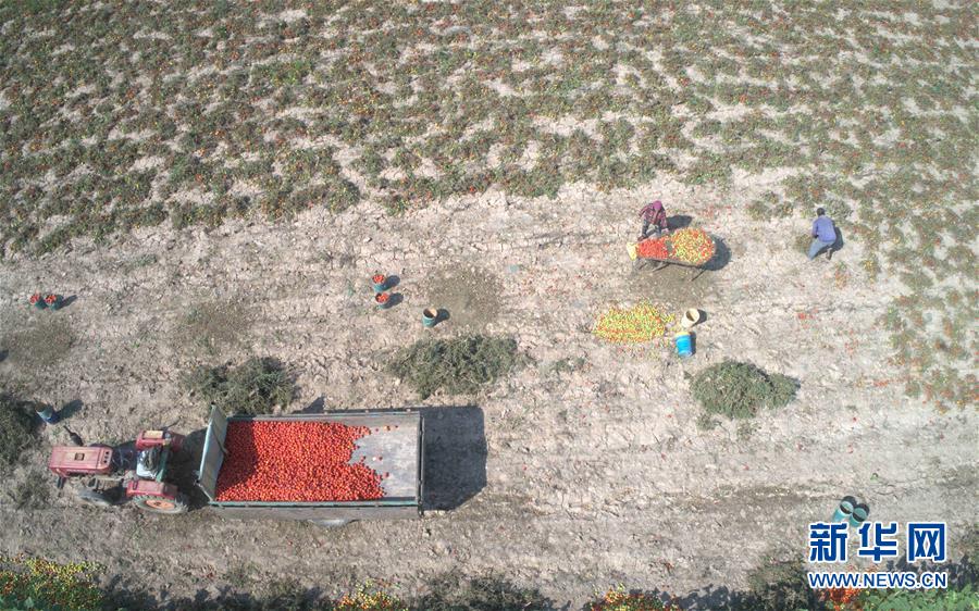 9月4日无人机拍摄的河套灌区友爱村四组村民仇汉强夫妇在收获番茄。 新华社记者 刘诗平 摄
