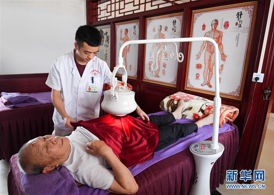 在位于江西省兴国县埠头乡枫林村的田庄上养老中心,一名医师在为一位老人进行中医理疗(8月19日摄)。 新华社记者 陈晔华 摄