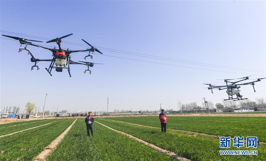在河北省故城县郑口镇果子口村化肥农药减量增效示范基地,工作人员操作无人机给小麦施肥(4月1日摄)。新华社记者 李晓果 摄