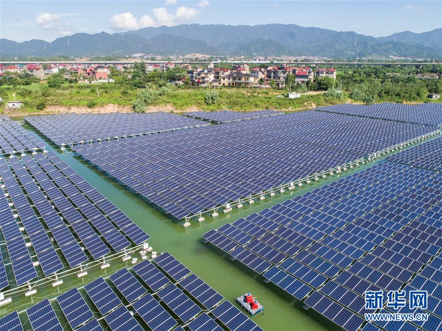 空中俯瞰浙江省衢州市上余镇的渔光互补光伏电站(8月2日无人机拍摄)。 新华社记者 徐昱 摄