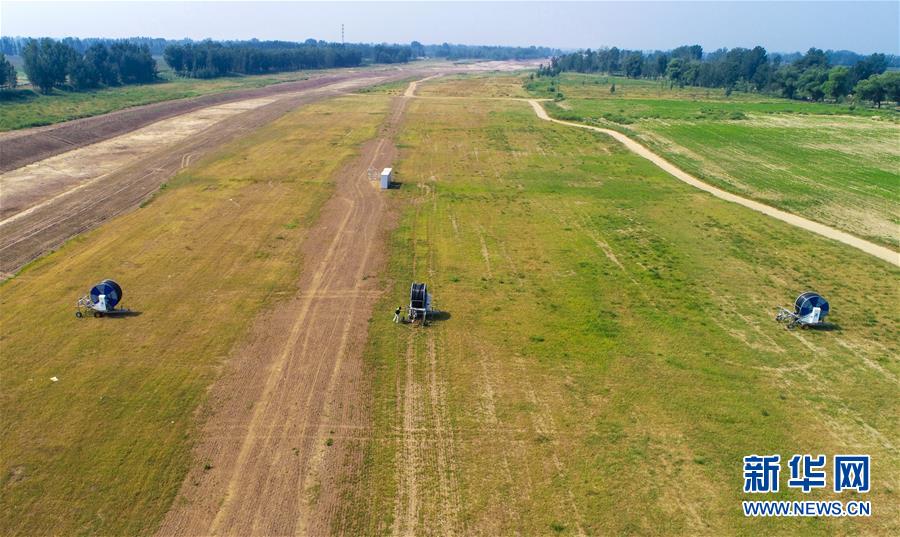9月5日,草场工作人员在用喷灌设备给牧草浇水 (无人机航拍) 。 新华社记者李晓果摄