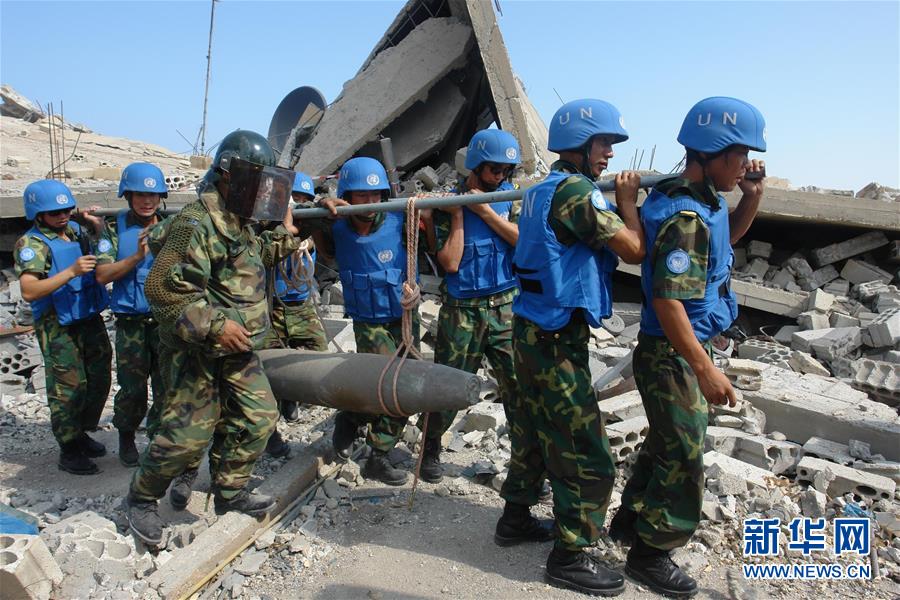 这张未注明拍摄日期的资料照片显示的是中国维和部队官兵在黎巴嫩南部转移未爆航弹。 新华社发